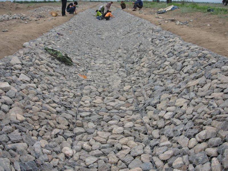 固滨笼具有固堤防冲刷的作用, 固滨笼工艺是指将特种钢丝由专用机械编织成双绞、蜂巢形网目的格网片,根据工程设计要求,裁剪、设计、组装成箱笼并装入块石等填充料后连接成一体的结构,用作提防、路基防护工程。