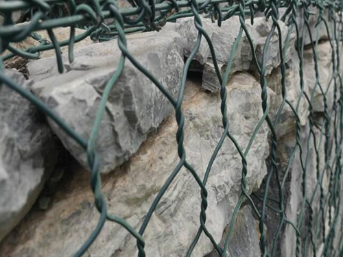 绿格网又称“格宾网”、“石笼网”,由各种网孔规格的绿格网片按照ASTMA975-97规范组装而成,工程现成填充石料组装形成柔性的、透水的、整体的支挡结构,常用于生态防护工程。该结构采用高热镀锌钢丝或者10%锌铝合金钢丝经过双线绞合编织而成的,其双线绞合部分的长度不能低于45mm,以保证绞合部分的防腐性能不被破坏。因为环境比较恶劣,污染比较严重,所以钢丝的表面涂塑(包PVC或者PE)增强钢丝的抗腐蚀性能。